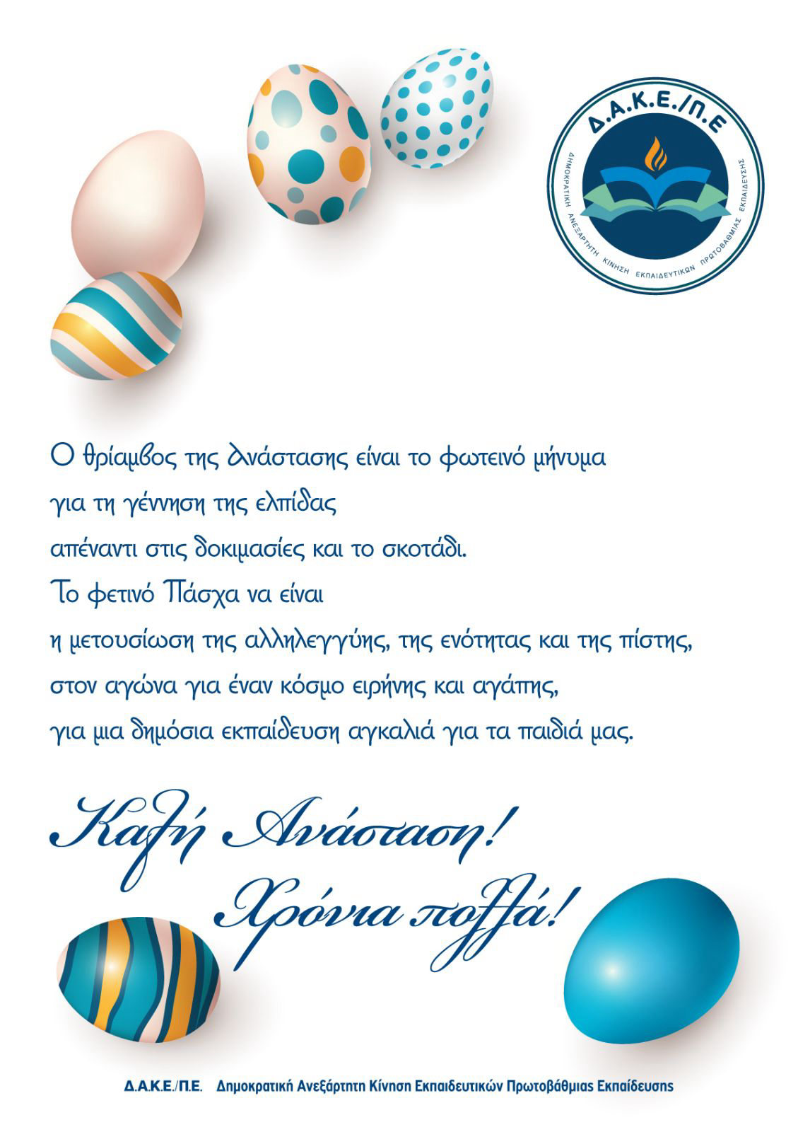 Ο θρίαμβος της Ανάστασης είναι το φωτεινό μήνυμα για τη γέννηση της ελπίδας απέναντι στις δοκιμασίες και το σκοτάδι. Το φετινό Πάσχα να είναι η μετουσίωση της αλληλεγγύης, της ενότητας και της πίστης, στον αγώνα για έναν κόσμο ειρήνης και αγάπης, για μια δημόσια εκπαίδευση αγκαλιά για τα παιδιά μας.